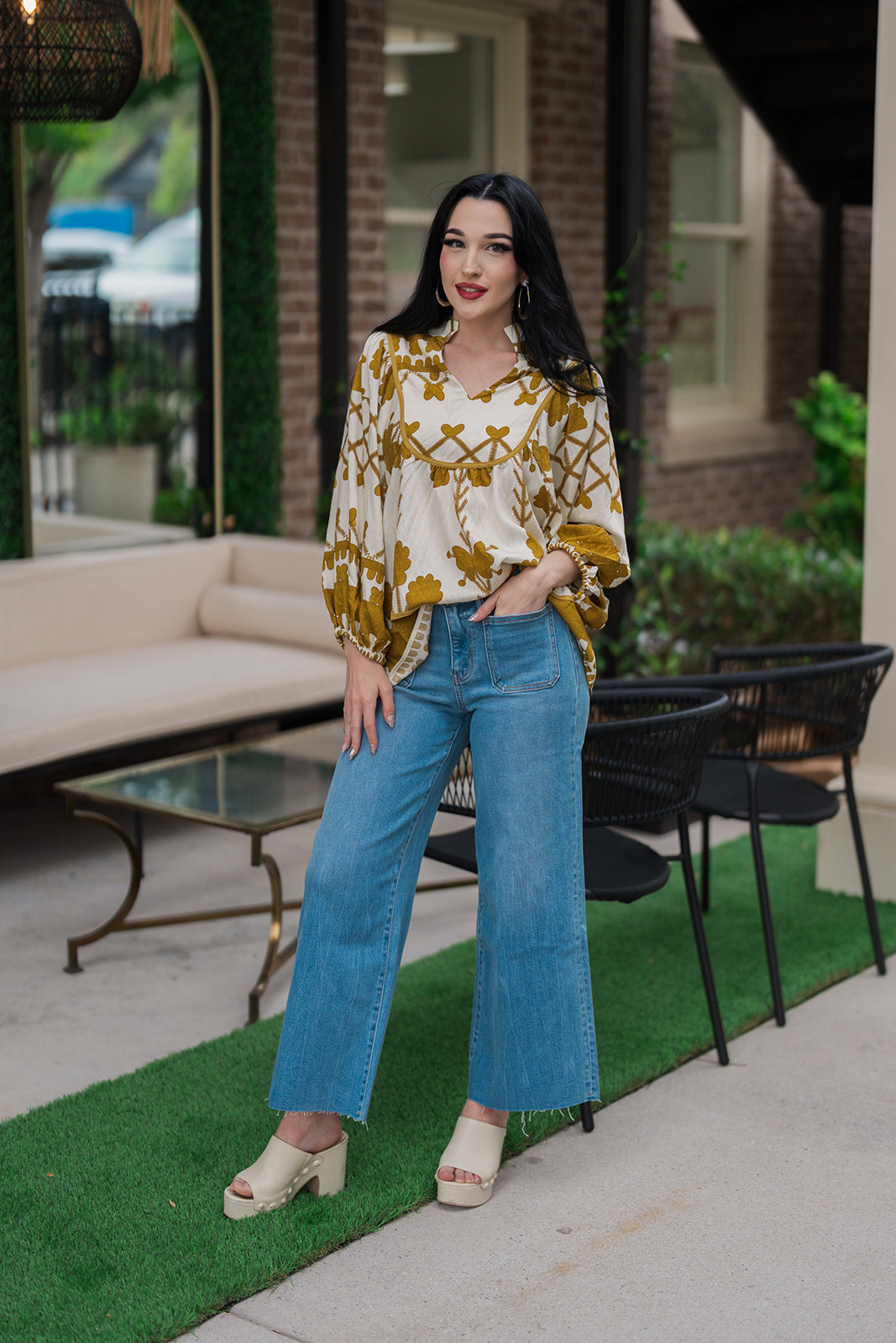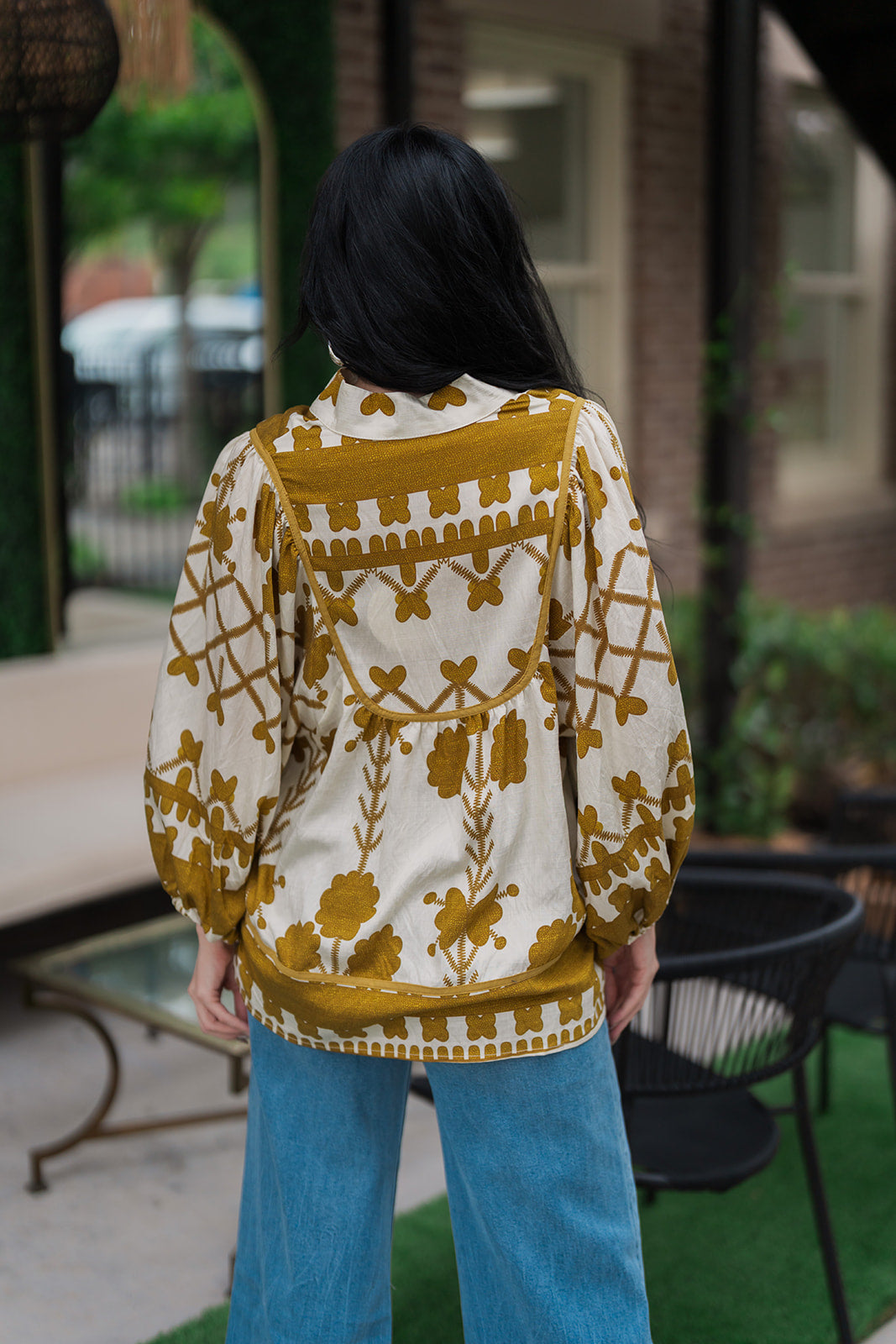 Embrace your inner free spirit with the Boho Trail Blouse, a stunning piece that’s perfect for exploring new horizons this autumn. In a captivating mustard green, this top features a striking tribal print that adds a touch of worldly charm and artistic flair. The classic split V-neckline offers a relaxed, flattering look, while the voluminous 3/4 bishop sleeves create a beautiful, flowy silhouette that’s both romantic and comfortable.