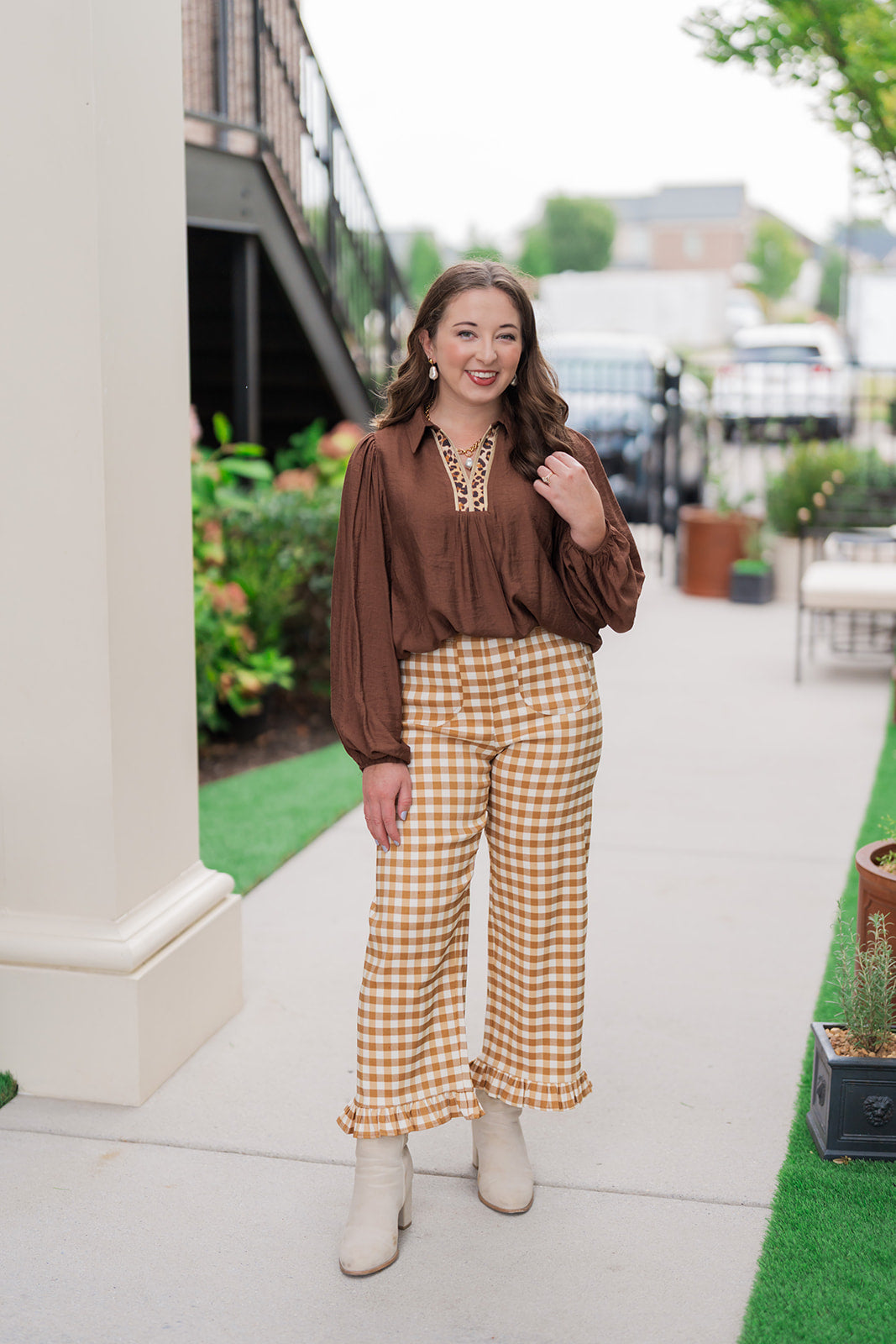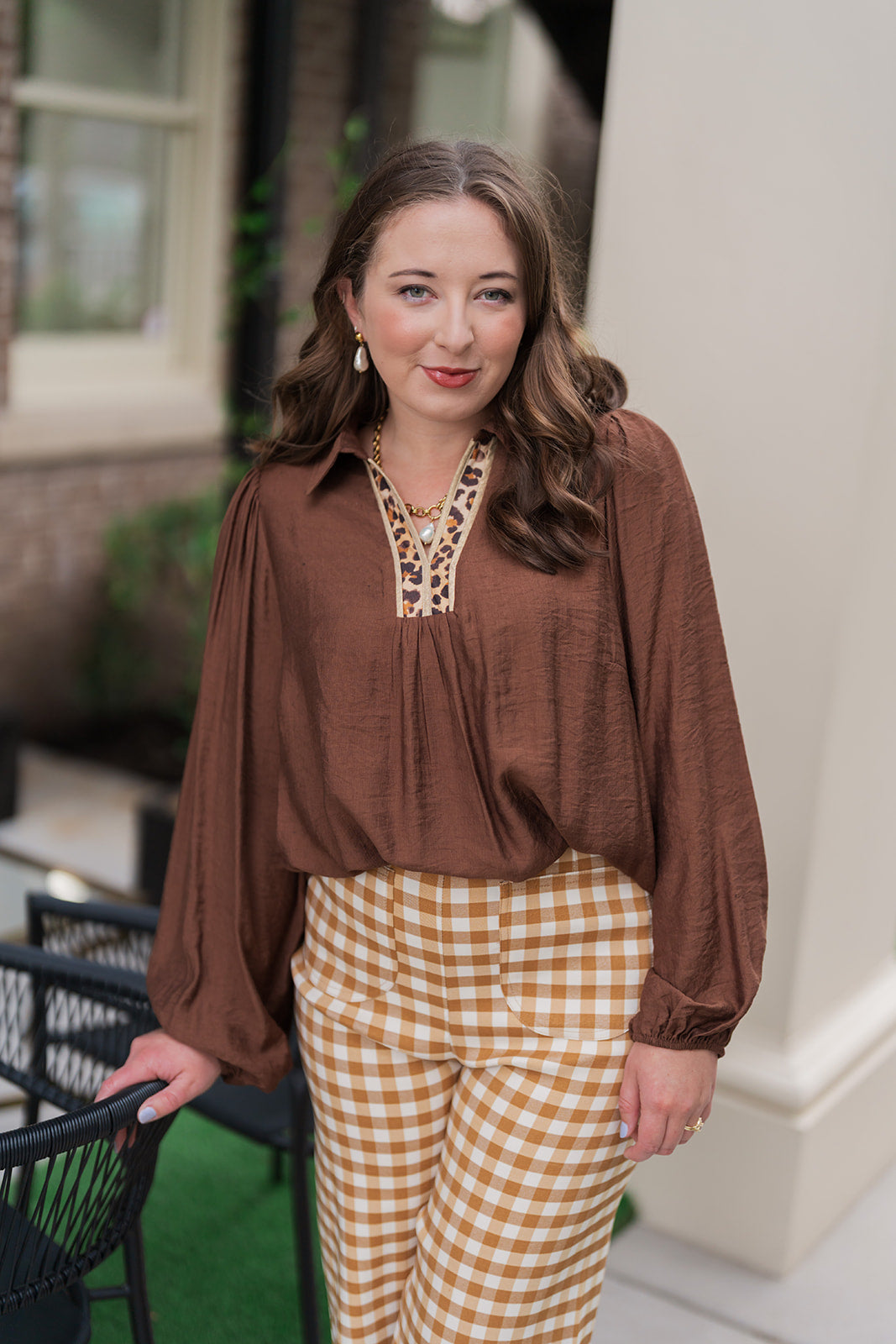 Unleash your wild side with The Jungle Cat Blouse, a chic and sophisticated piece that's perfect for the fall season. This beautiful long-sleeve top comes in a rich, warm brown that serves as the perfect canvas for its striking details. The elegant split V-neck with a collar creates a classic, polished look, while the bold leopard print trim adds a daring touch of modern style.