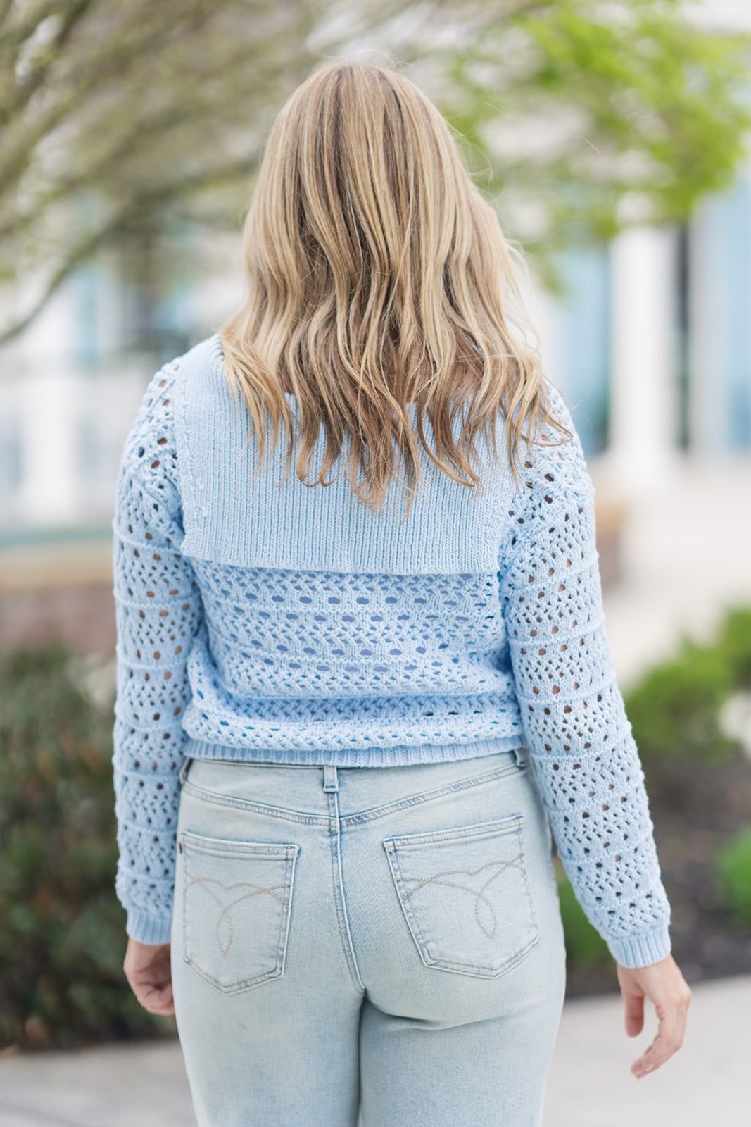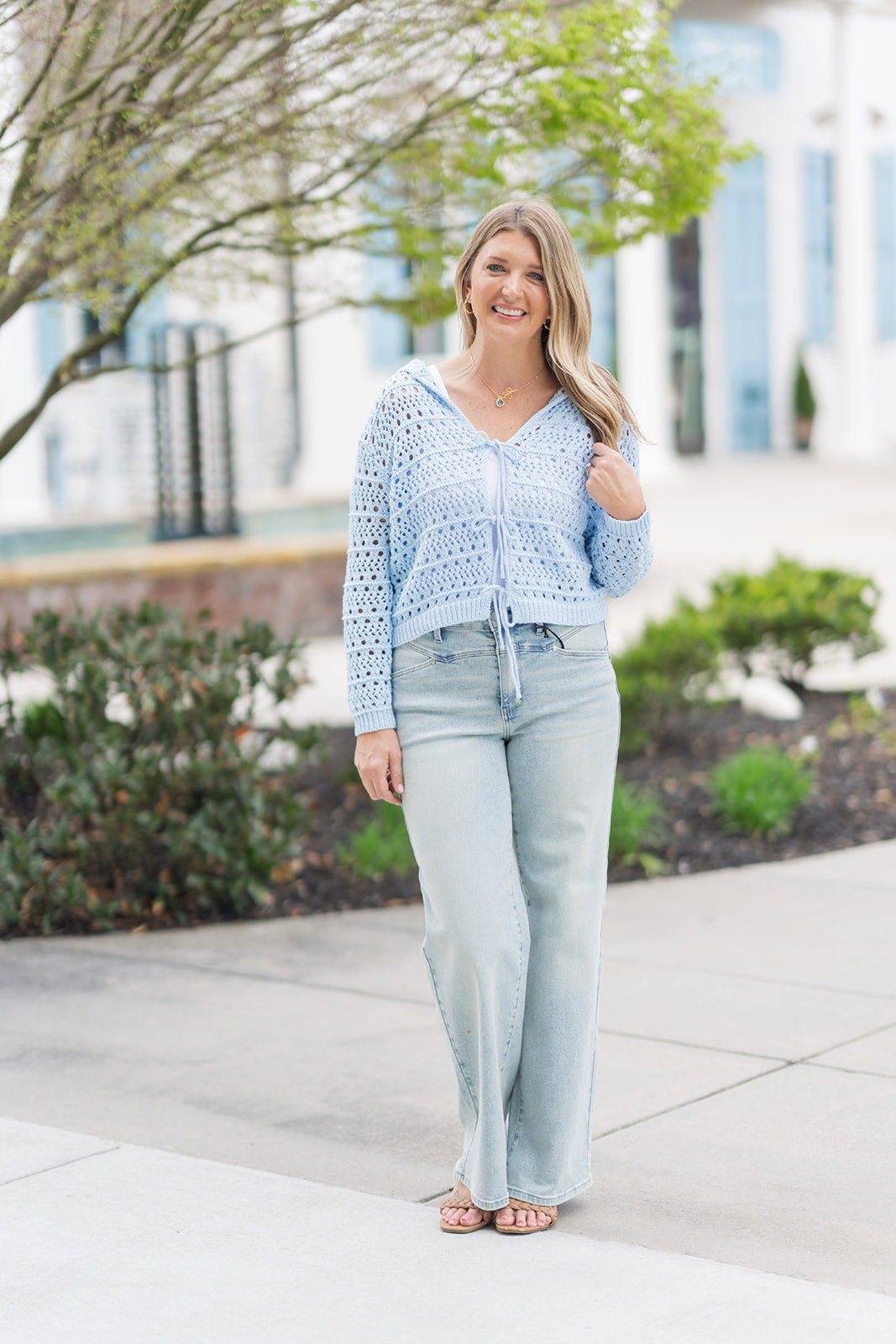 For a cohesive, cool-toned look, pair the Malibu Mist Cardigan with light-wash, wide-leg denim (as seen in the photo) and a simple white bodysuit underneath. The tonal blue-on-blue aesthetic is very "on-trend" for the season. Complete the outfit with tan braided sandals and a gold dainty pendant necklace to add a touch of warmth to the cool palette.