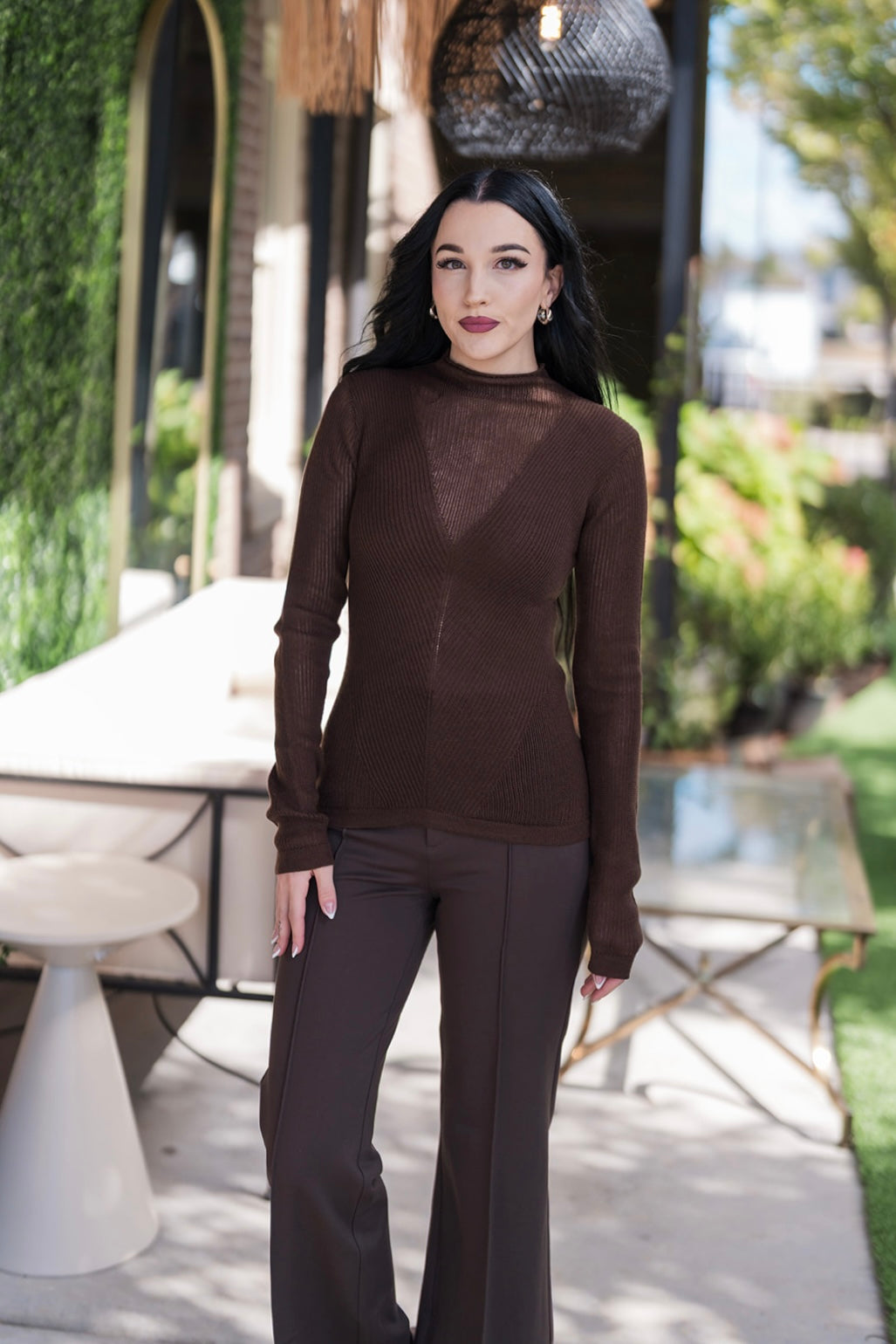 Step into a new era of elegance with The Martin Knit Top, a piece that beautifully balances classic sophistication with a touch of modern allure. This women's top is crafted from a soft, ribbed knit in a rich dark brown, giving it a luxurious texture and a comfortable, figure-hugging fit. The stunning design is defined by its elegant mock turtleneck and a unique sheer panel that delicately extends from the neckline down the chest. This subtle detail adds a hint of sophisticated drama, making this a perfect top for those who appreciate both timeless style and contemporary flair.
