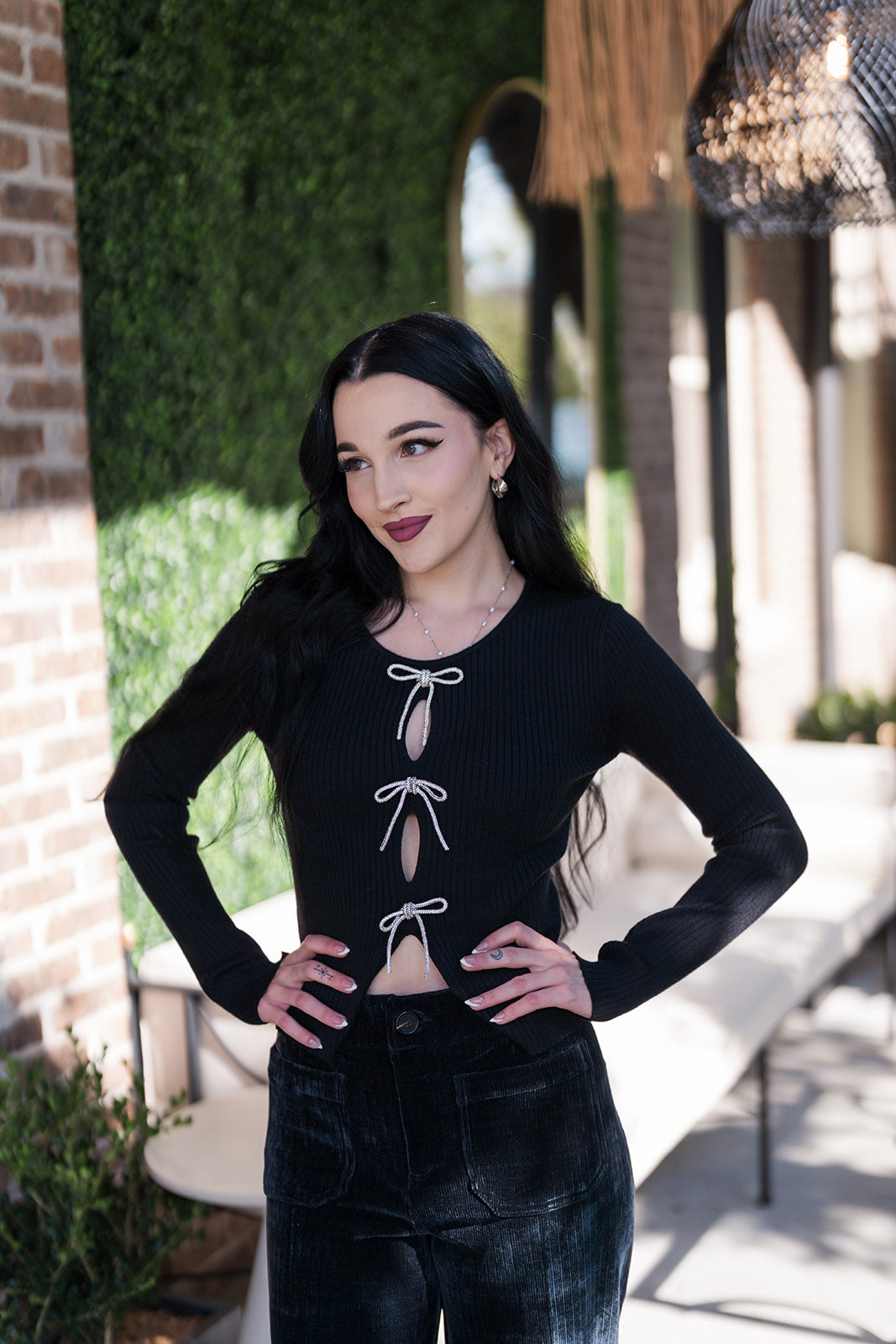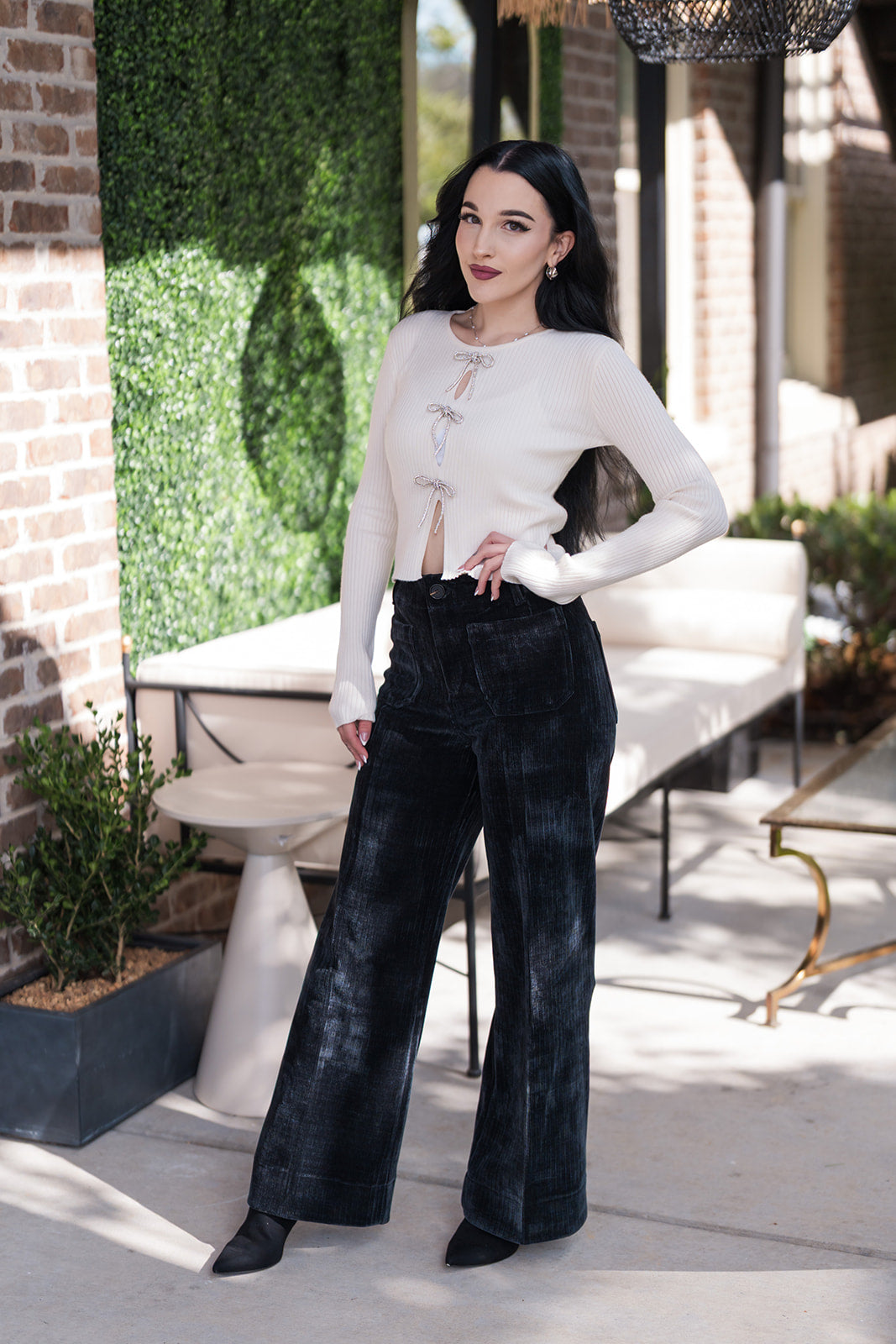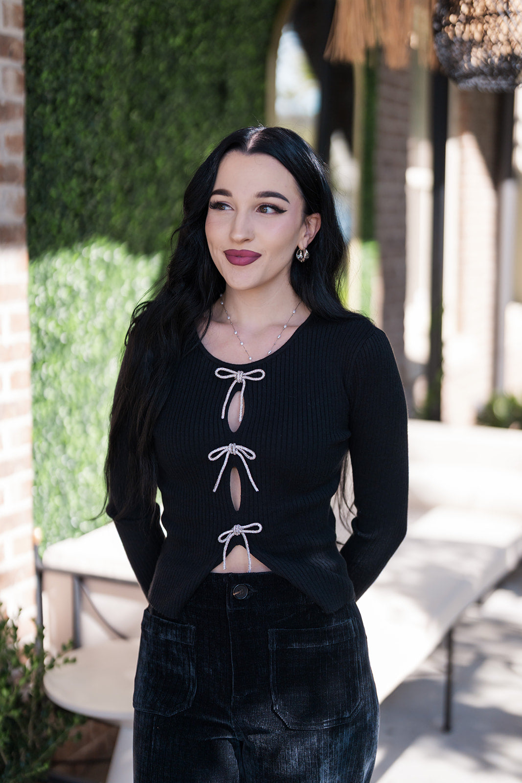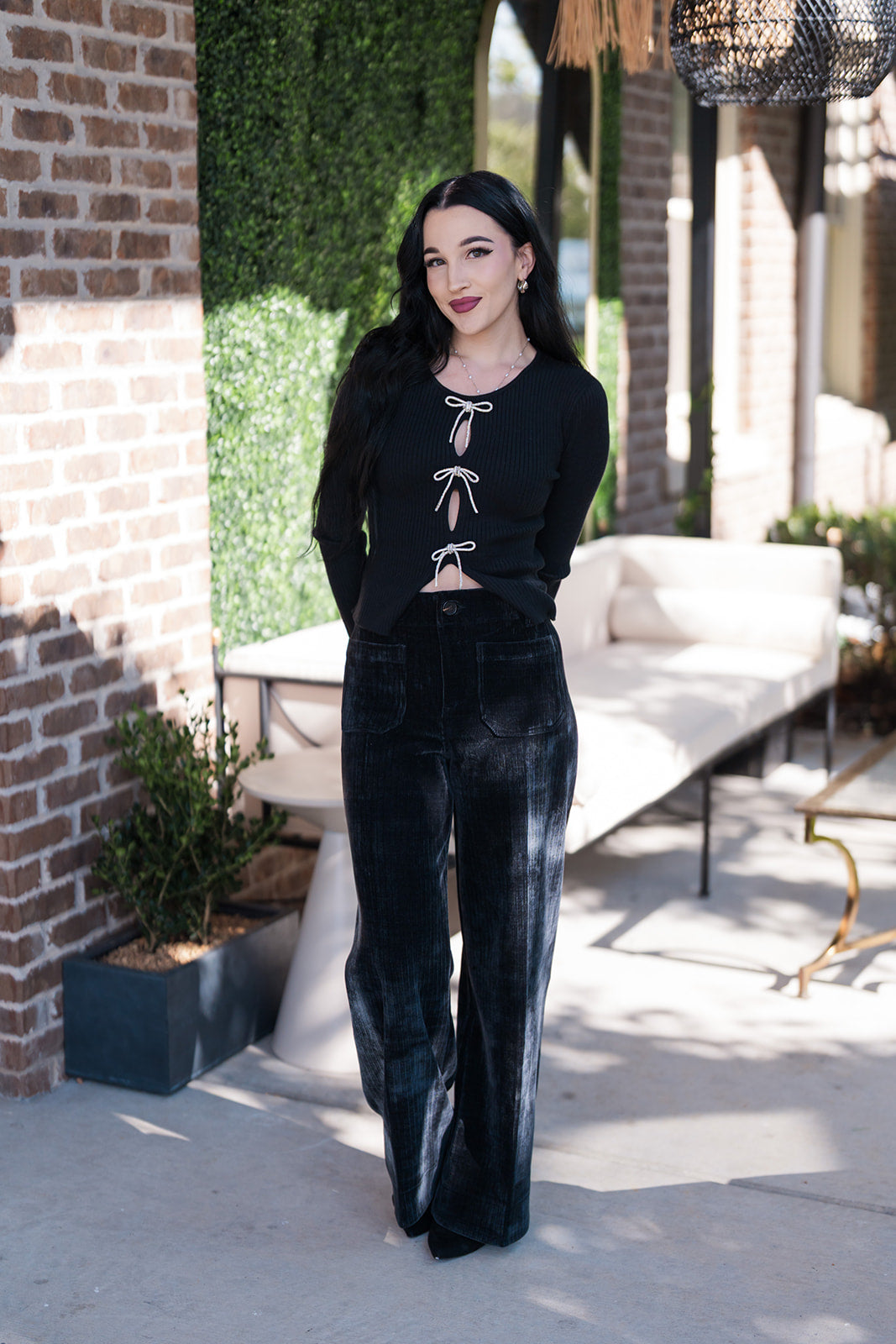 The Midnight Ribbon Cardigan is designed for both style and comfort. Its relaxed fit and cropped length create a modern silhouette that pairs perfectly with high-waisted bottoms. The ribbed knit provides a cozy feel and adds a subtle texture that elevates the entire look. The unique ribbon ties add a delicate, eye-catching element that sets this piece apart. Its versatility and undeniable charm make it a must-have for your fall wardrobe, allowing you to effortlessly transition from a casual daytime outing to a stylish evening event.