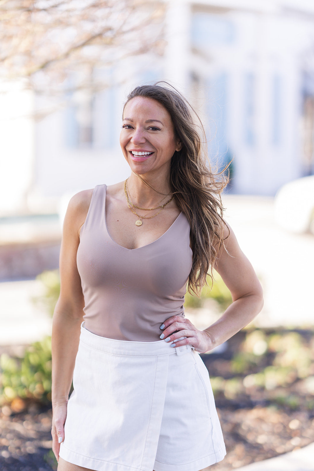 To achieve an effortless weekend vibe, style this bodysuit with your favorite distressed denim jeans and an oversized button-down shirt worn open. Add a pair of sleek loafers and a gold pendant necklace to highlight the flattering V-neckline. For a night out, tuck it into a leather midi skirt and add strappy heels—the deep V-back adds an unexpected and sultry detail to an otherwise simple ensemble.