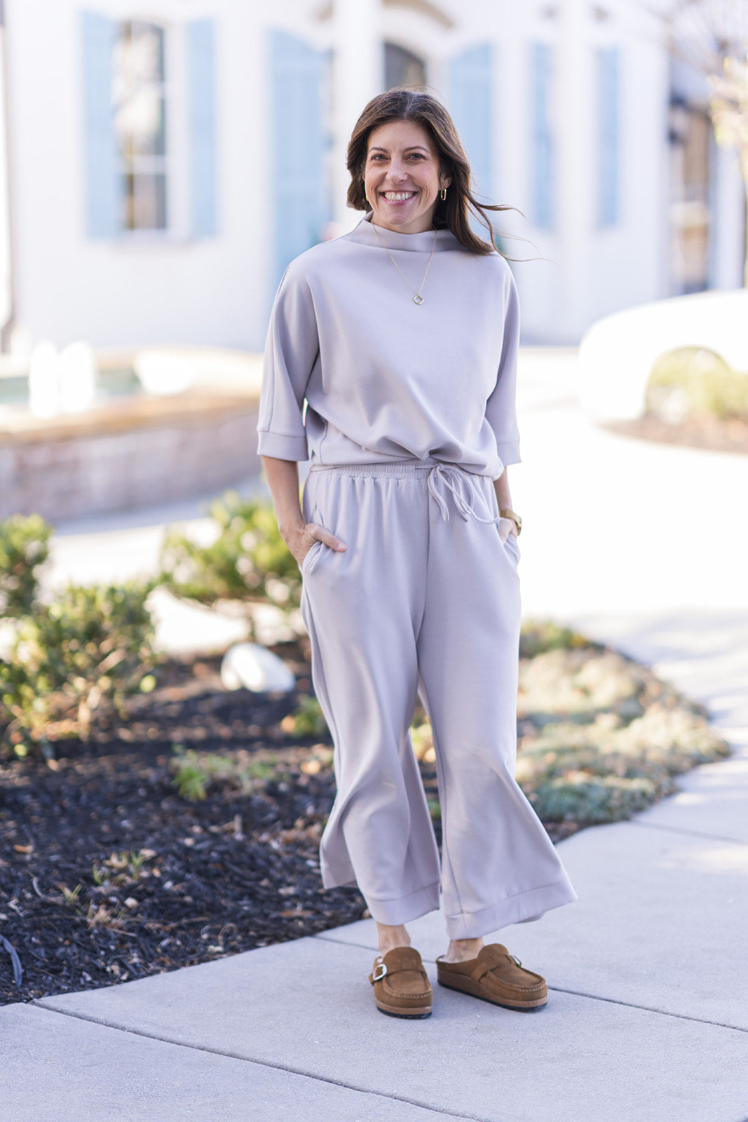 For a sleek and coordinated look, pair the Polished Pebble Top with its matching knit lounge pants and silver minimalist jewelry. This monochrome ensemble creates a high-fashion "set" look that is perfect for traveling in style or a chic day of working from home. Add a pair of leather mules to transition the outfit for a coffee date or casual lunch.