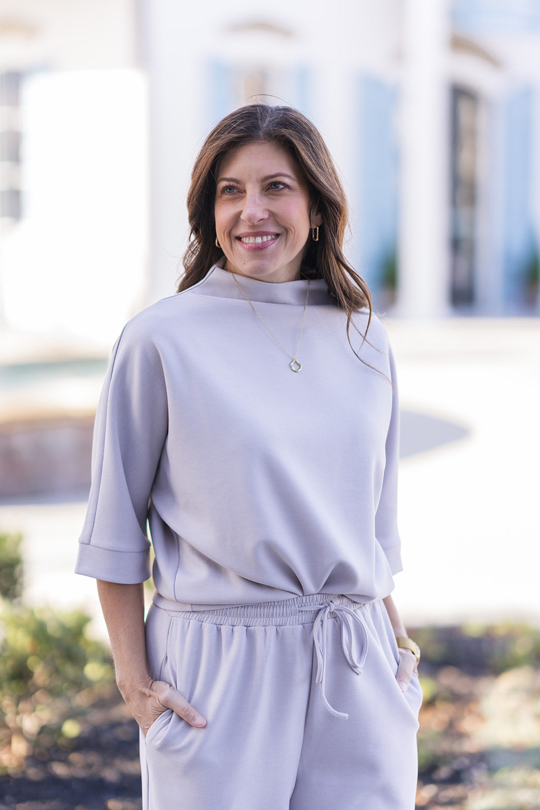 Redefine your everyday basics with the Polished Pebble Top, a masterclass in modern minimalism and architectural silhouette. As we step into a new season of clean lines and effortless sophistication, this scuba mock neck knit top stands out as the ultimate foundation piece for a polished boutique wardrobe. The soft, neutral pebble-grey hue offers a calming, versatile palette that pairs seamlessly with everything in your closet, while the high-tech scuba knit fabric provides a structured yet incredibly comfortable fit that maintains its shape from morning meetings to evening social hours.