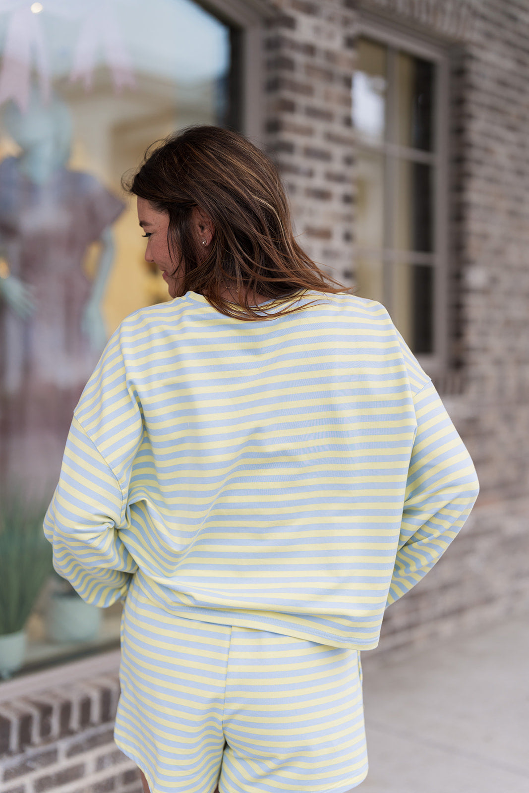 Indulge in the ultimate coastal relaxation with the Seaside Sorbet Sweatshirt. Designed for those who crave both comfort and a pop of playful color, this striped terry loose-fit lounge sweatshirt is a refreshing addition to your off-duty wardrobe. The alternating horizontal stripes of soft sunshine yellow and cool sky blue evoke the nostalgic feeling of a boardwalk treat, making it the perfect piece to brighten up a rainy morning or a breezy sunset stroll on the beach.
