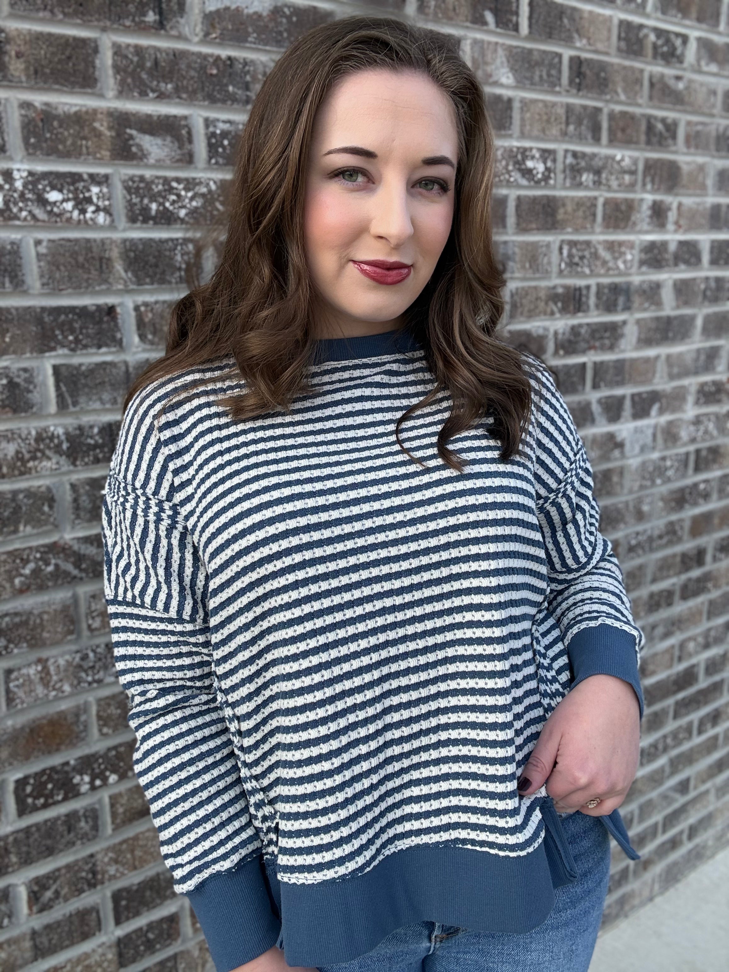 Capture the breezy, effortless essence of a coastal escape with the Seaside Stitch Pullover. As we drift into the fresh energy of 2026, this Stripe Exposed Seam Split Hem Long Sleeve Knit Top stands out as a premier staple for your transitional wardrobe. Featuring a classic nautical-inspired blue and white stripe pattern, this piece brings a sense of calm sophistication to your everyday look. The design is elevated by modern, edgy details like raw-look exposed seam detail, proving that even the most timeless patterns can have a contemporary boutique twist.
