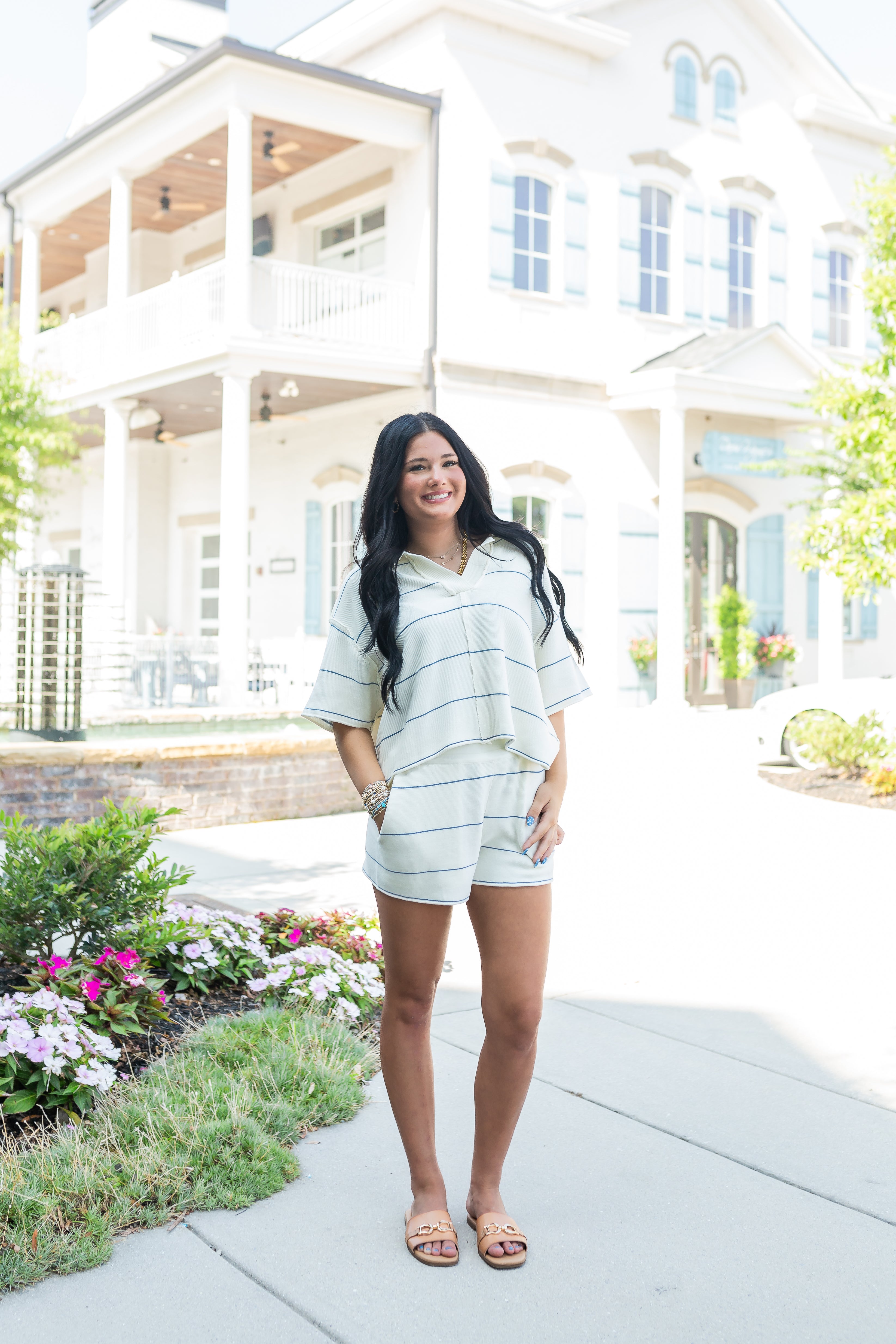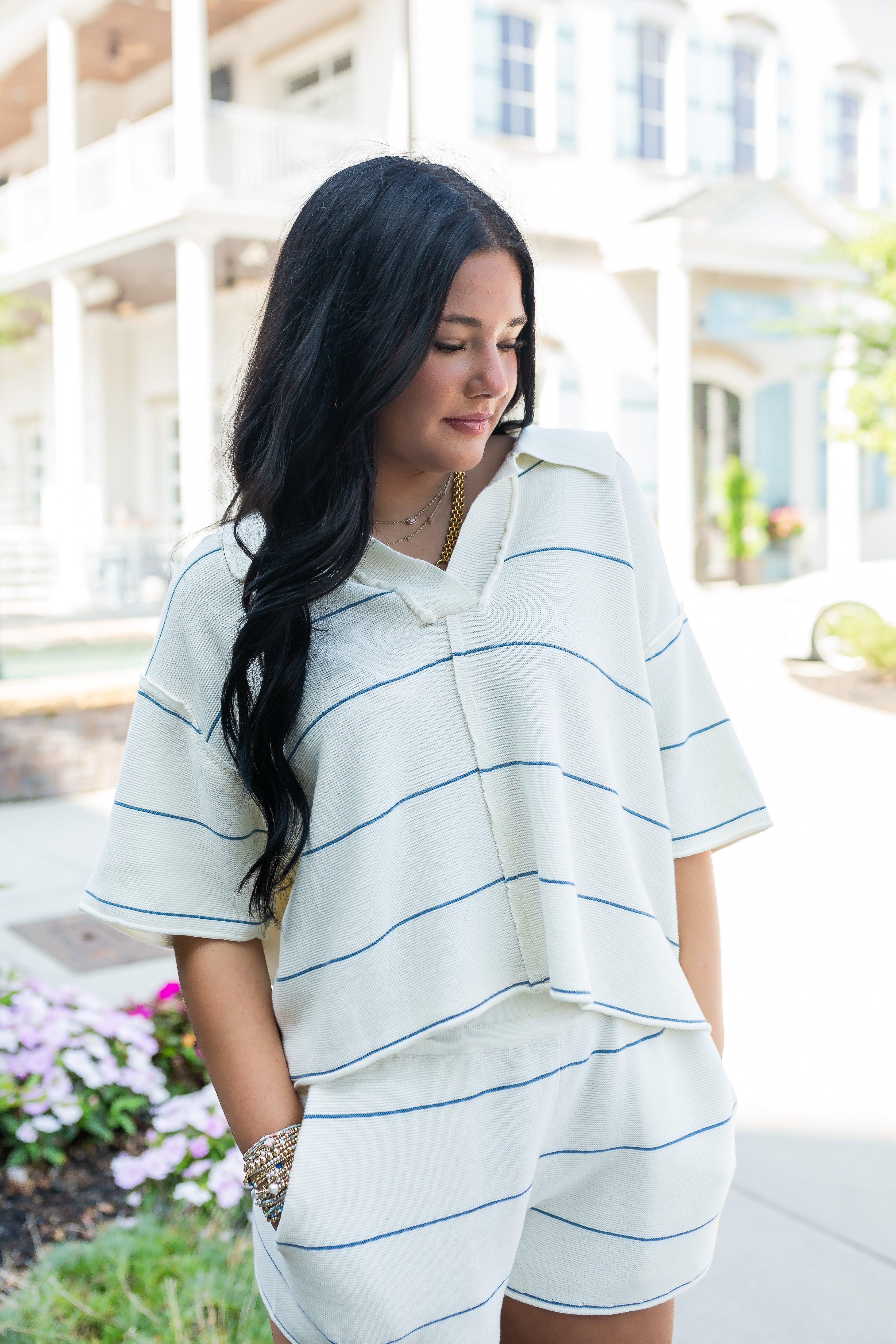 Embrace effortless style with The Seaside Stripe, featuring a blue and white striped pattern and a cozy knitted collar. This top combines classic nautical charm with comfortable wearability, making it perfect for casual outings or relaxed weekends. Its timeless design adds a fresh, breezy touch to your wardrobe, ensuring you look polished with minimal effort.