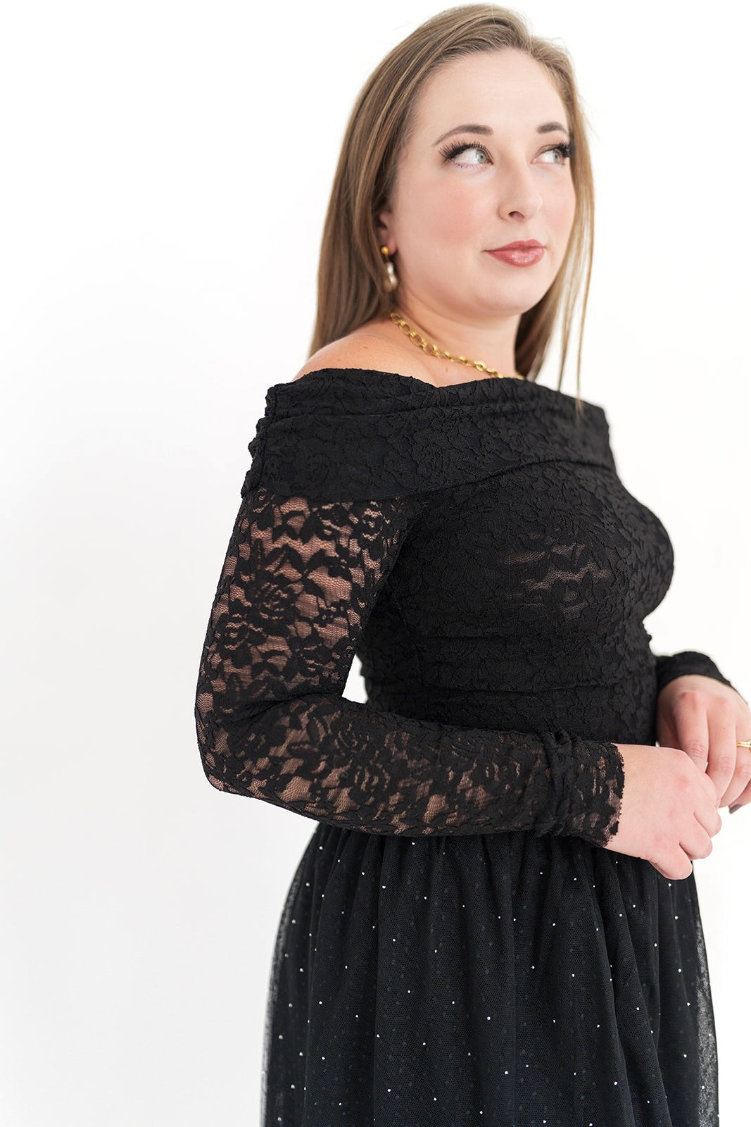 The Sanai Lace Bodysuit is thoughtfully designed to flatter with luxurious details. It features an alluring off-the-shoulder neckline, highlighting the collarbones and shoulders for a feminine touch. The bodice and long sleeves are completely covered in the delicate lace, providing beautiful texture and a form-flattering fit. The snap closure at the bottom ensures a secure and comfortable fit all day or night long. Whether you're dressing for a date night, a festive event, or simply adding drama to your casual wear, this lace bodysuit's versatility and timeless black color make it an essential item for sophisticated, bold looks.
