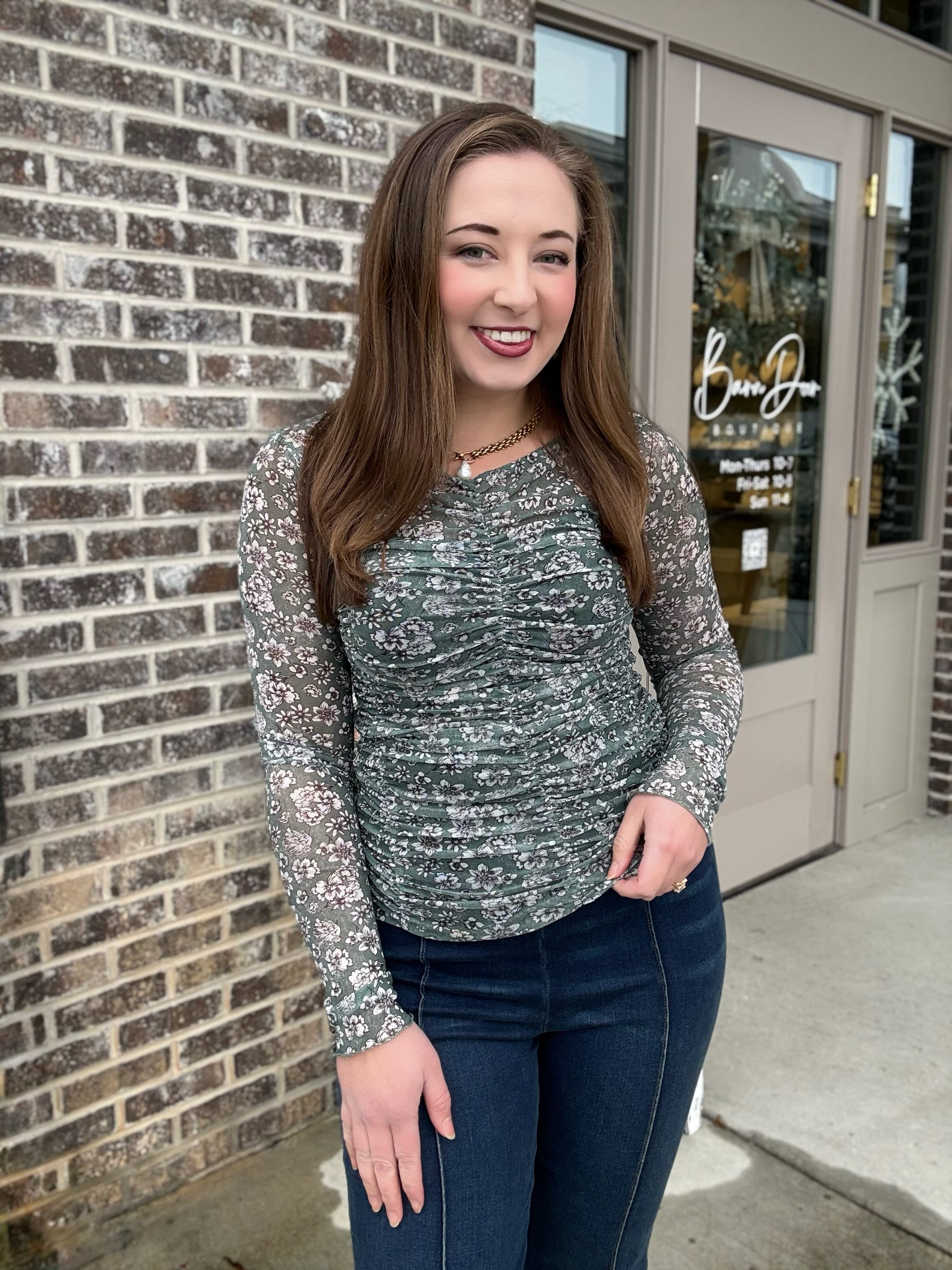 Unlock the romance of botanical style with the Secret Garden Mesh Top. This Lettuce Hem Mesh Print Top is a dreamy, delicate essential for layering this season, blending soft, sheer fabric with a beautifully fitted and flattering silhouette. Adorned with a delicate, small-scale floral print, this top brings a touch of spring's vibrancy into your fall and winter wardrobe. Whether you choose the deep, moody green or the warm, rich rust, this top offers endless styling possibilities.