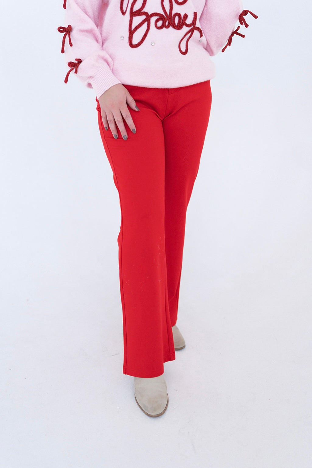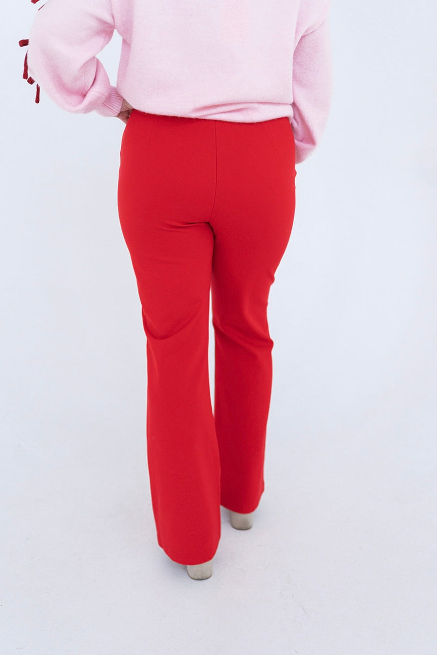 Command attention with The Showstopper Trousers, a powerful and figure-flattering pant designed for dramatic entrance. These women's trousers are crafted from a soft, high-stretch woven fabric in a vibrant, bold Red that makes an instant statement. The high-waisted fit beautifully defines your figure and creates a long, lean line, while the tailored silhouette subtly flares out from the knee for a perfect bootcut or subtle flare shape.