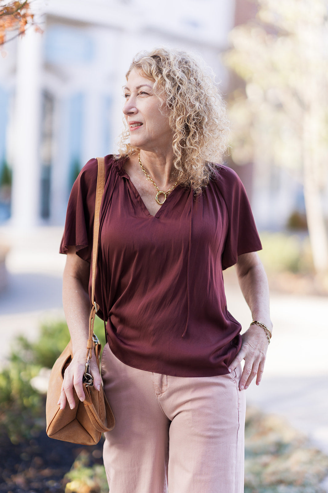 Denim Contrast: Tuck this blouse into high-waisted dark wash flare jeans. The deep wine color pops against denim, making for a perfect "polished-casual" weekend ensemble.