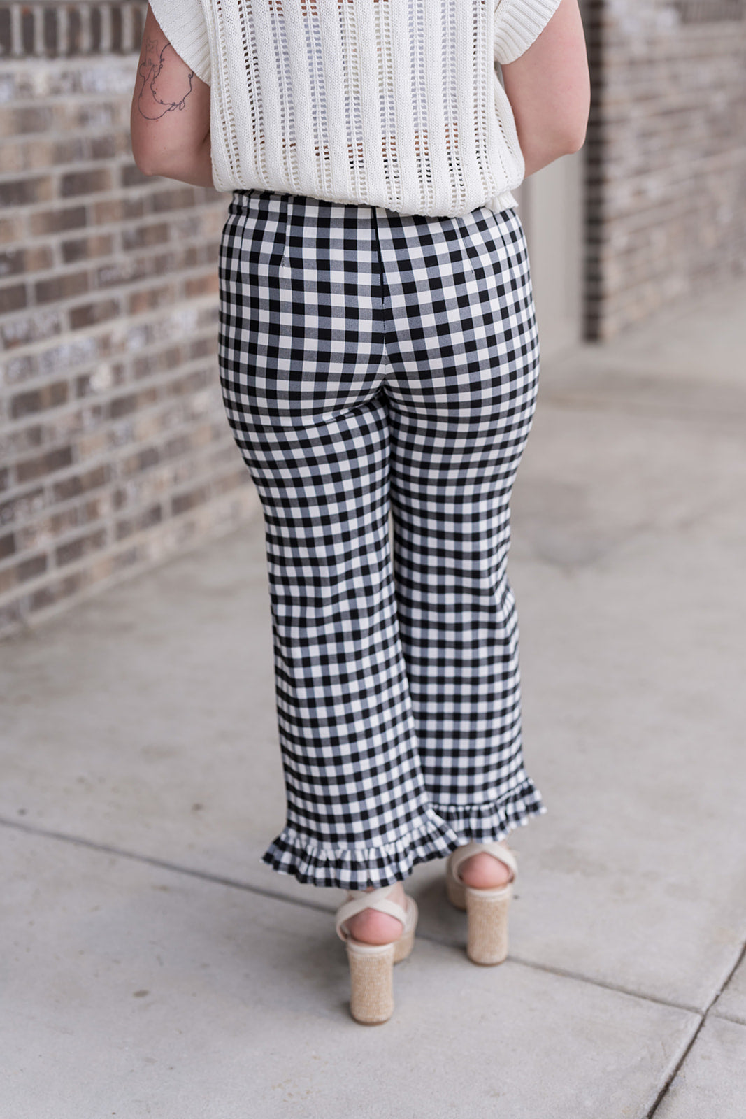 Step into timeless charm with the City Stroll Ruffle Pants, a perfectly playful yet polished addition to your seasonal wardrobe. Designed for the woman who loves a vintage-inspired aesthetic with a modern twist, these pants are the ultimate statement piece for your next daytime outing. Featuring a classic black and white gingham pattern, they offer a sophisticated graphic appeal that never goes out of style. Whether you're wandering through a local farmers' market, heading to a casual brunch, or enjoying a scenic boardwalk walk, these trousers ensure you look effortlessly put-together while maintaining a sense of whimsical flair.