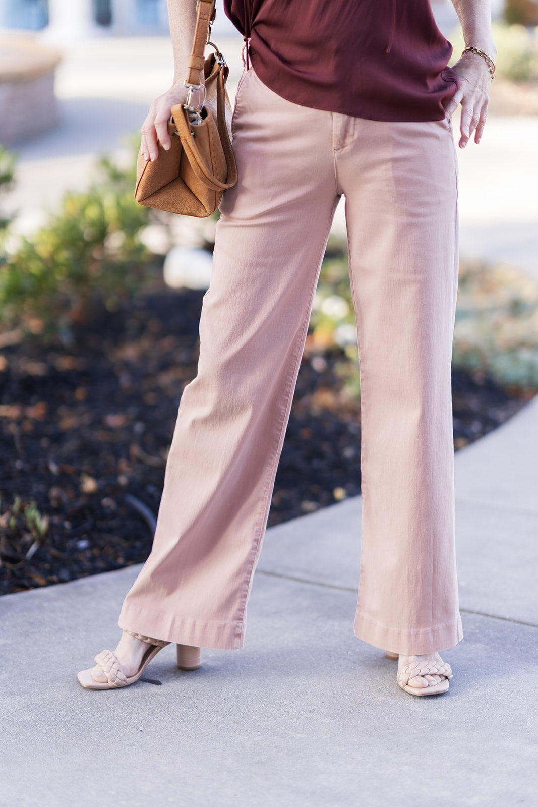 To achieve a chic, "Old Money" vibe, style these pants with our Boardwalk Breeze Vest and a pair of pointed-toe flats. The high-waisted fit is perfect for showcasing a statement belt in a coordinating leather tone. For a more casual weekend ensemble, pair them with the Hot Cocoa Mock Neck and chunky white sneakers. As the sun sets, layer on a cropped denim jacket or a lightweight cardigan like the Desert Bloom Cardi to maintain the balanced proportions of the wide-leg silhouette.