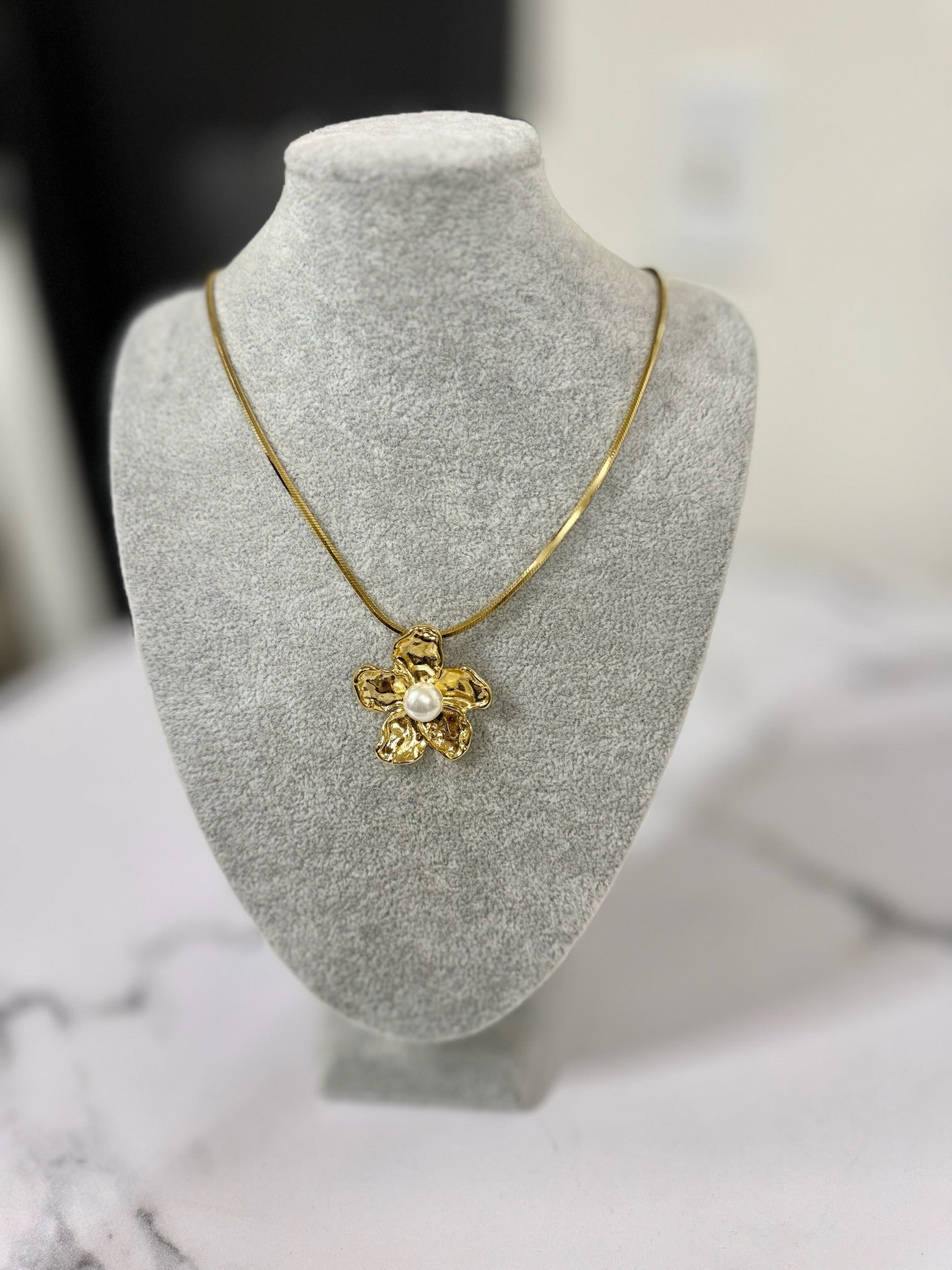 Step into a world of botanical elegance with the Enchanted Flower Necklace, a stunning statement piece that captures the organic beauty of a blooming garden. This necklace features a bold, sculptural flower pendant with a unique "hammered" gold texture that gives it a vintage, artisanal feel. At the center of the blossoming petals sits a luminous, creamy pearl, adding a touch of classic sophistication to the modern, textured design. Suspended from a sleek and silky herringbone snake chain, the pendant glides effortlessly, catching the light with every move you make. It is the perfect blend of bold femininity and high-fashion edge, designed to be the focal point of any outfit.