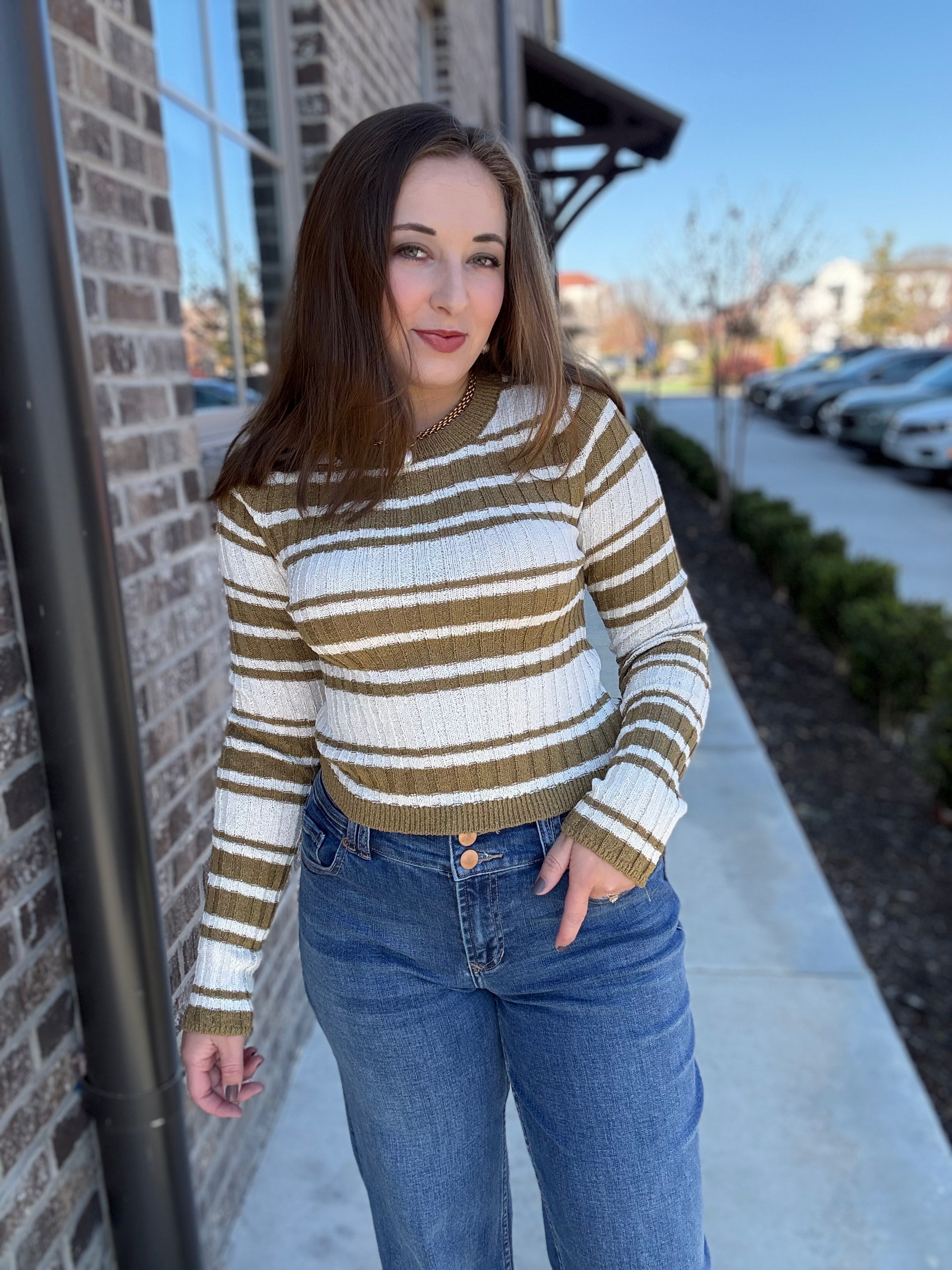 The top is crafted from a soft, fine-gauge ribbed knit that offers a subtle texture and ensures a flattering, fitted silhouette that beautifully hugs the body. It features a classic crew neck that maintains a clean, traditional look, making it incredibly easy to layer. The long sleeves are finished with a delicate, slightly flared or lettuce edge cuff, adding a subtle feminine touch. The cropped length is perfectly on-trend, making it the ideal partner for high-rise pants and skirts, eliminating bulkiness and helping to define the waistline. Whether you're dressing for casual outings or aiming for a more polished setting, the Horizon Hues Sweater effortlessly transitions. This piece is highly searchable using keywords like fitted striped knit, mustard yellow sweater, ribbed cropped top, and versatile long-sleeve knitwear. Elevate your style with this comfortable, chic, and brilliantly colored staple.