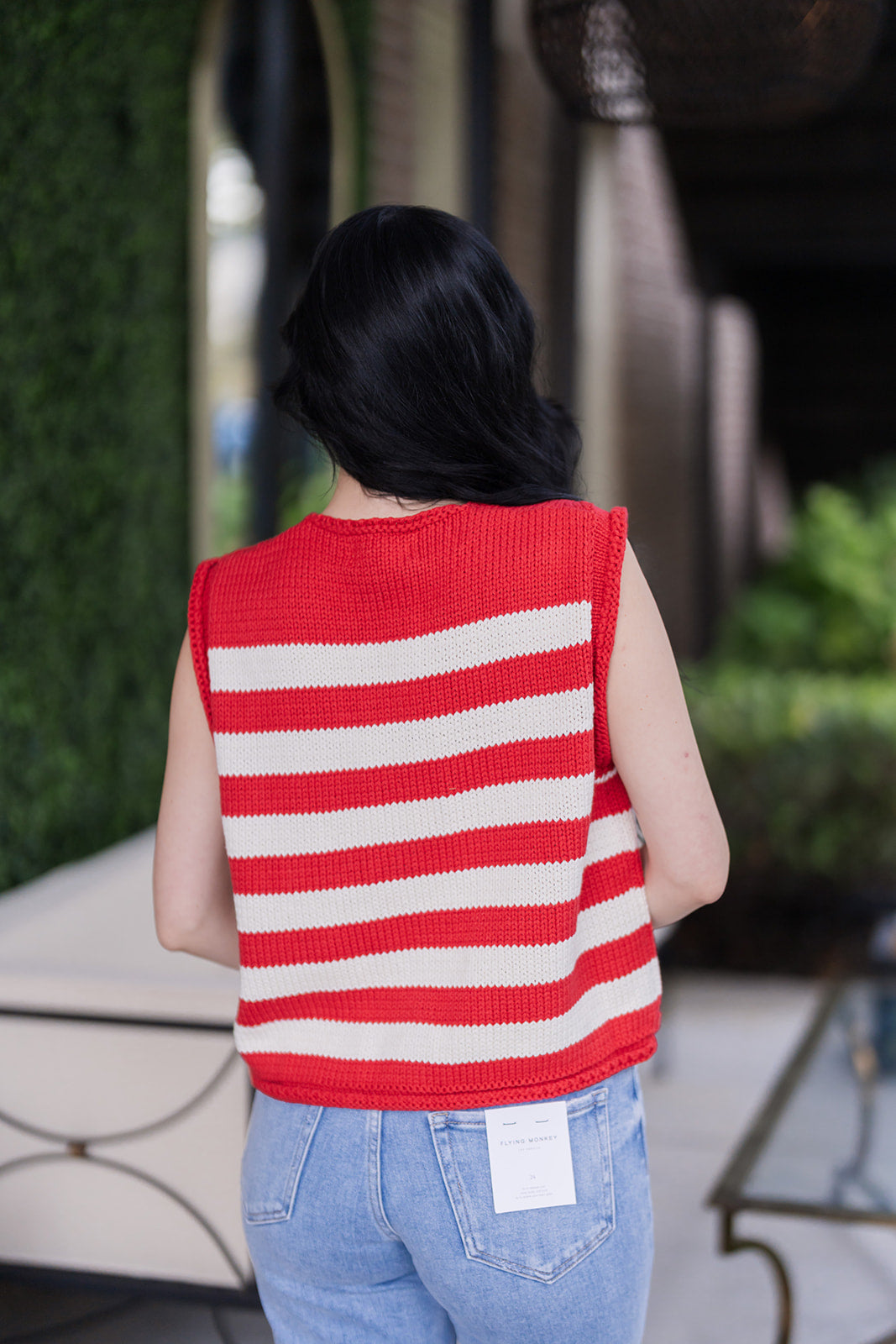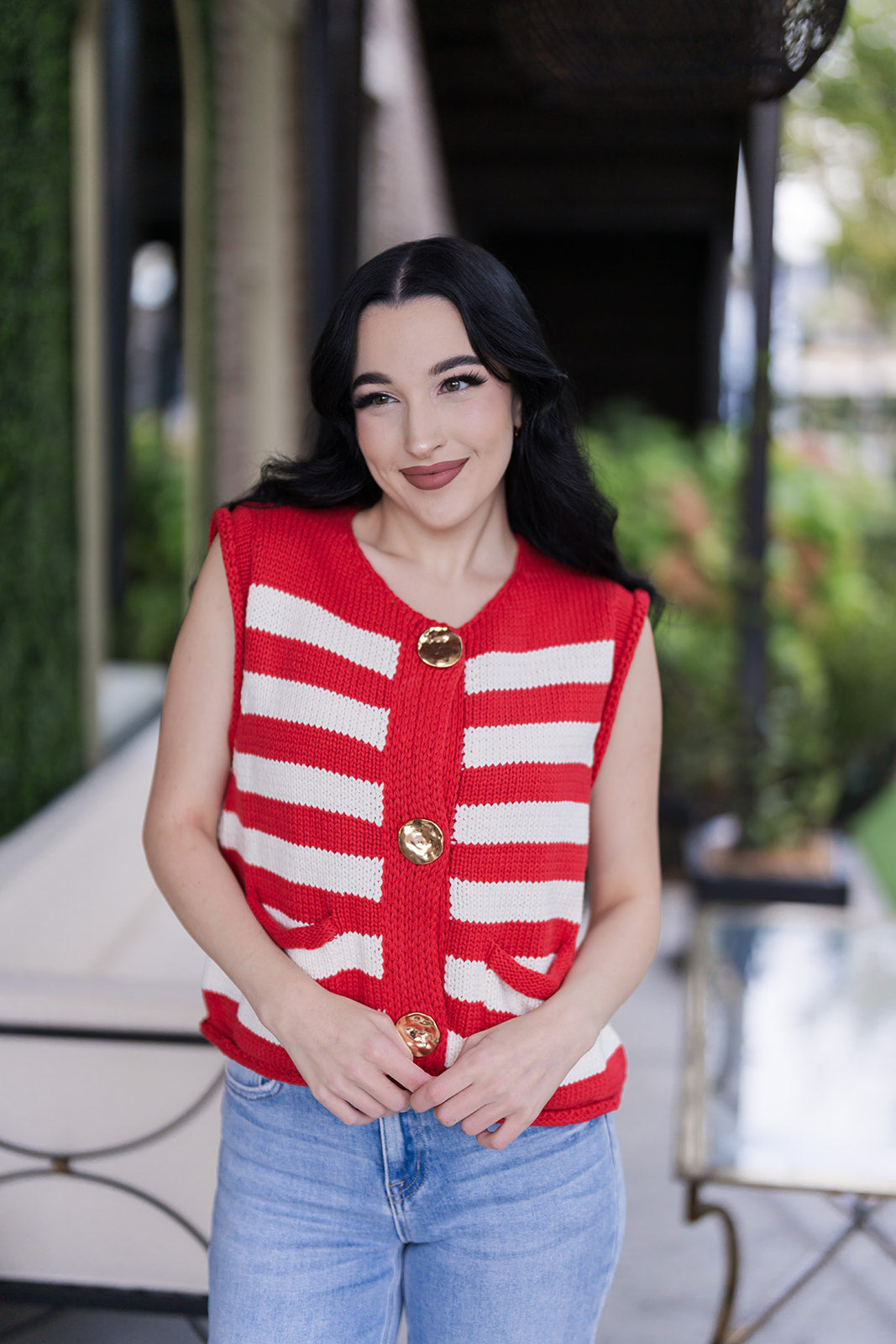 Channel classic nautical charm with the Maritime Sweater Vest. This isn't just a sweater; it’s a chic and playful layering piece that adds a touch of retro flair to any outfit. The bold, classic striped pattern in deep red and cream creates a timeless look that feels both vintage and current. With its sleeveless design and cozy knit, this piece is the perfect transition item for those in-between seasons, offering a stylish alternative to a traditional sweater.
