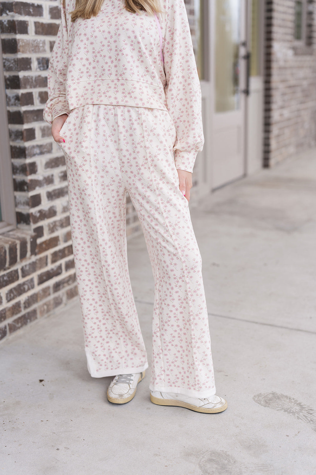 The Petite Petal Pants feature the same romantic, all-over mini floral motif found in the coordinating top, showcasing soft pink and neutral petals that dance across a crisp white background. Designed in a classic jogger silhouette, they boast a flattering elastic waistband with an adjustable drawstring, allowing you to customize your fit for maximum ease. The signature pink flatlock stitching runs down the sides, mirroring the design of the pullover and creating a streamlined, sporty aesthetic. Crafted from a premium cotton-poly blend, these joggers provide a breathable, move-with-you stretch that maintains its polished shape throughout the day. It is the ultimate "set-it-and-forget-it" outfit for the girl who refuses to choose between looking adorable and feeling incredibly cozy.