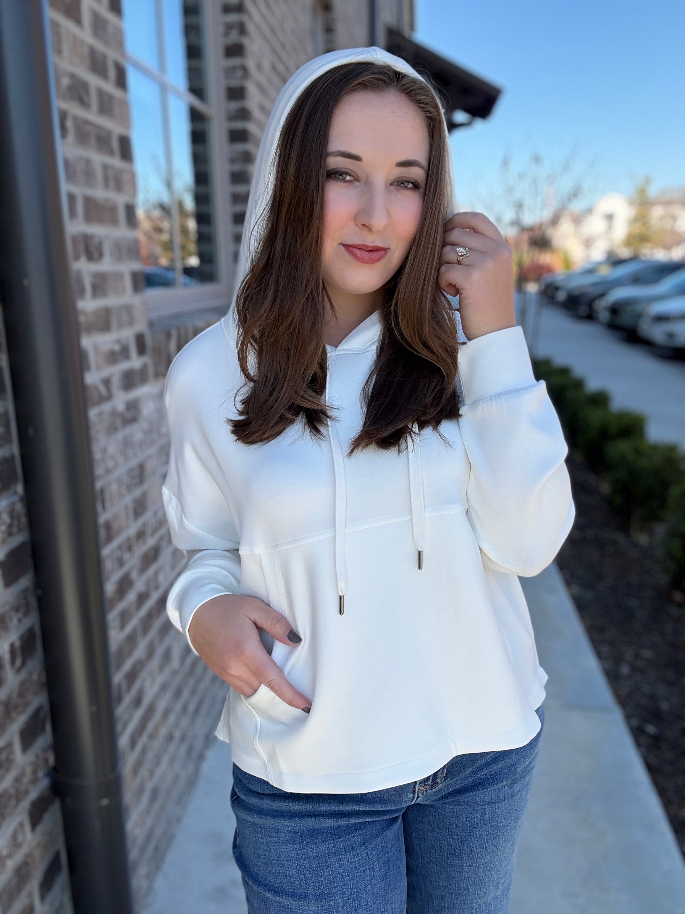 Everyday Elevated: Combine the Ivory White hoodie with light wash, straight-leg denim jeans or tailored cream trousers. Layer a long, thin trench coat over the top and add a simple gold pendant necklace and pointed flats for a surprisingly chic and polished casual outfit.