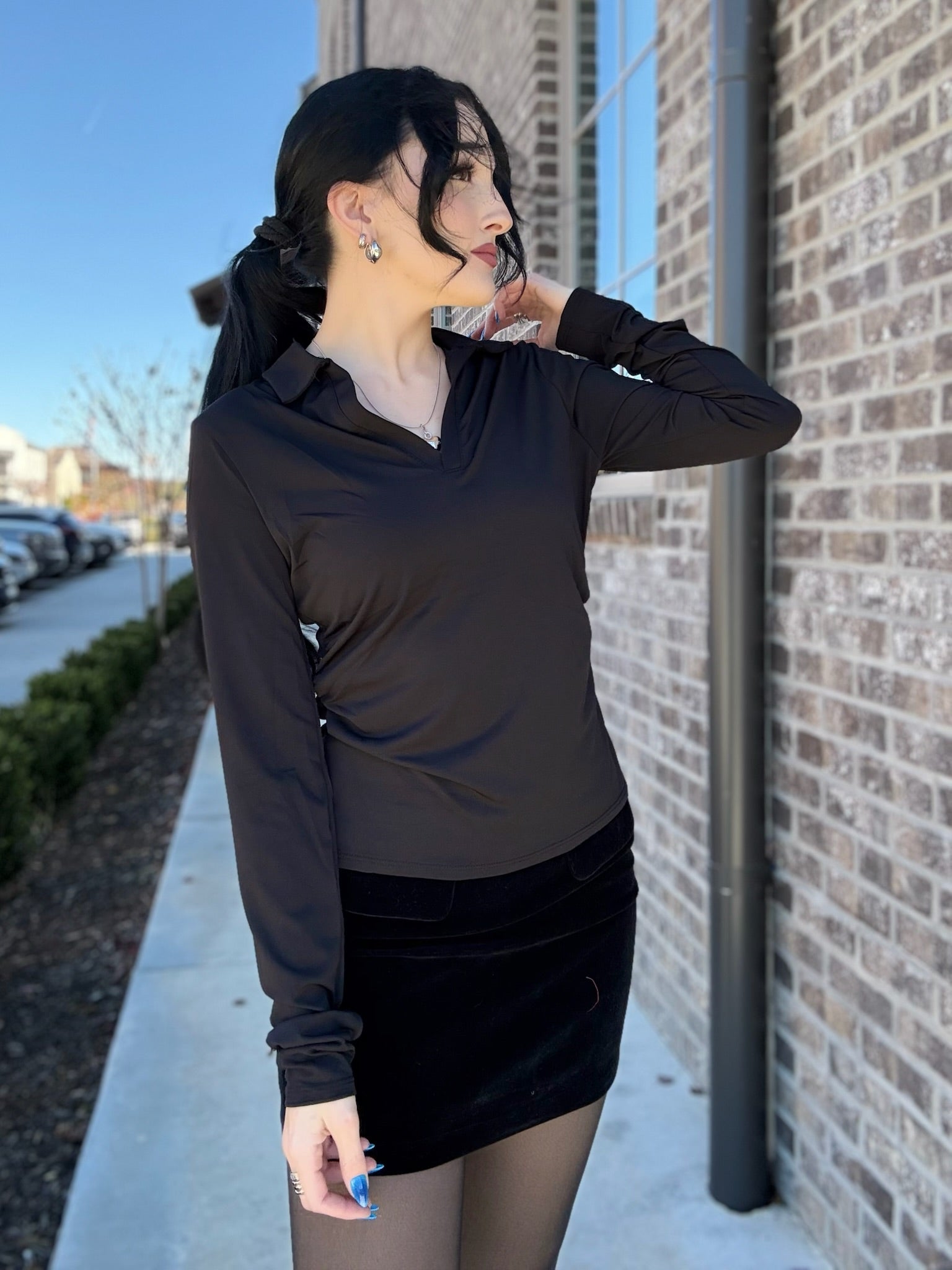 Achieve a look of polished modernity with the Silhouette Sleek Top, the ultimate foundational piece designed to hug your curves and provide a seamless blend of comfort and style. This chic, long-sleeve top is an absolute essential for building sophisticated outfits, whether you're navigating the transitional seasons or seeking a sharp layering piece for cooler evenings. Crafted in a classic jet black, this top is guaranteed to be a high-rotation item in your wardrobe.