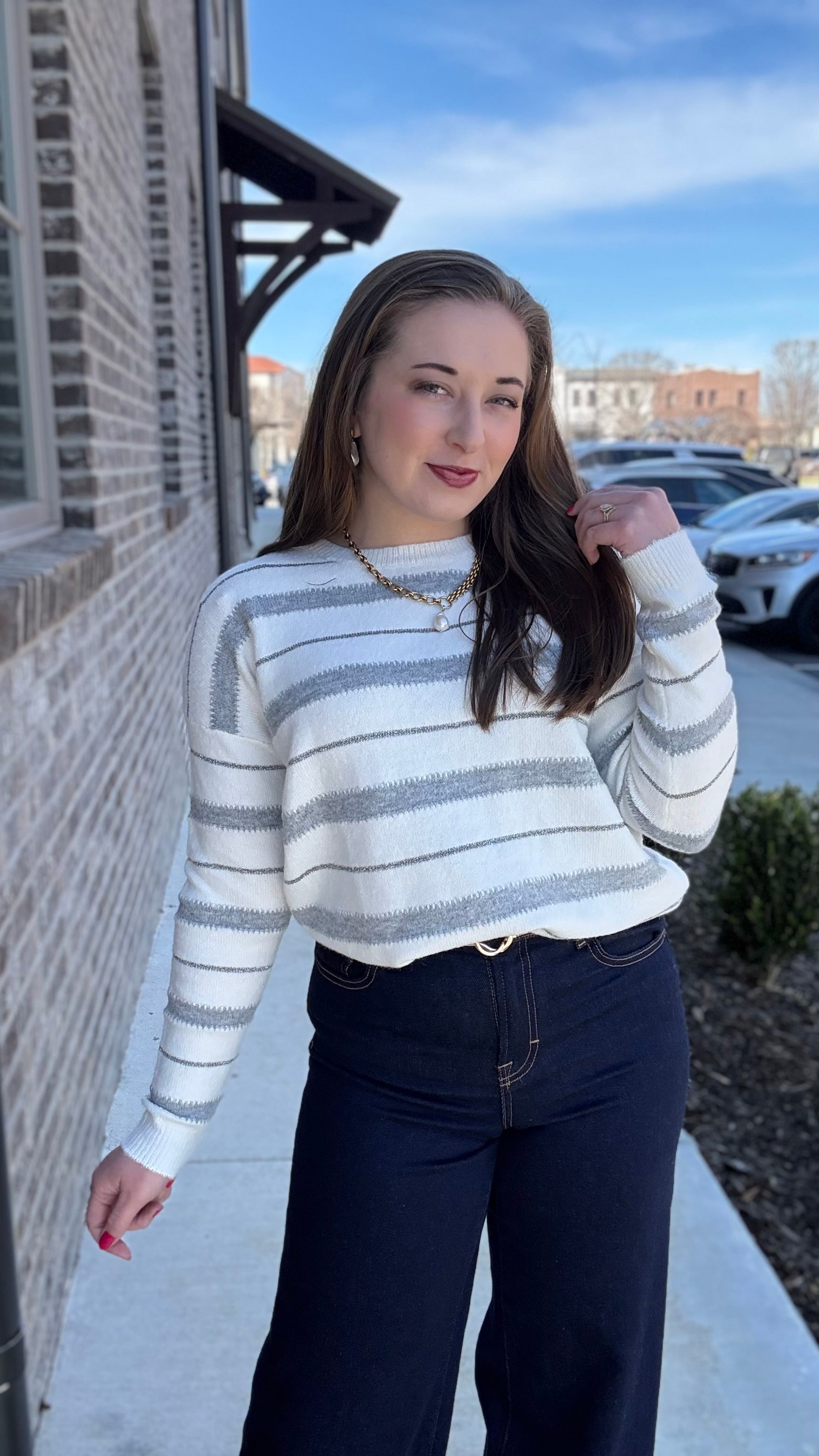 For a classic winter aesthetic, pair the Silver Lining Stripe Sweater with high-waisted dark wash denim and leather ankle boots. The stripes add just enough detail to keep a simple outfit feeling curated.